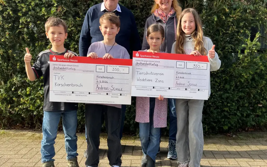 Die Schülerinnen und Schüler der Andreas - Schule Korschenbroich haben auf ihrem Schulfest zum Motto \"Gemeinsam sind wir stark\" für Selbstgebasteltes die beachtliche Summe von 700 Euro eingenommen. Das schuleigene Kinderparlament, bestehend aus den KlassensprecherInnen der einzelnen Klassen, hat sich nach einer regen Diskussion dazu entschieden, den eingenommenen Betrag in…